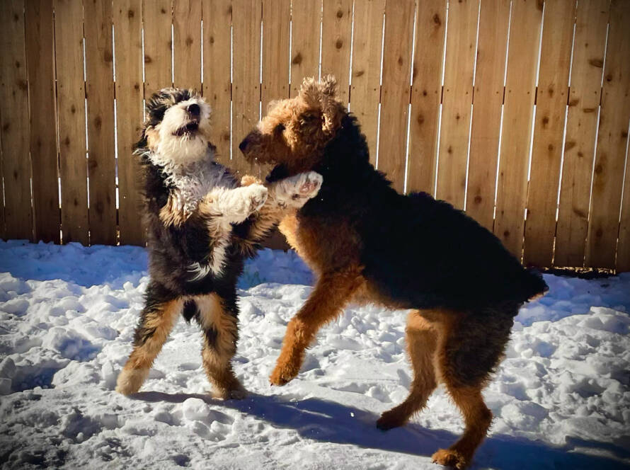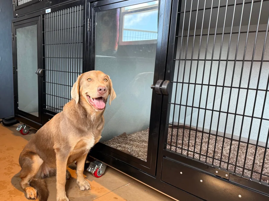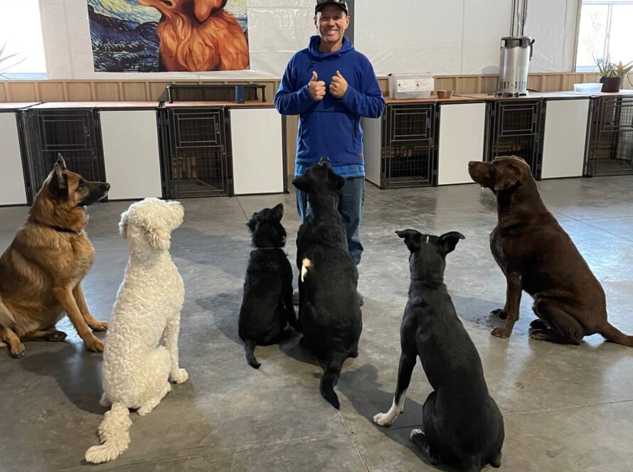 Boarding dogs interact and play with the daycare dogs during their stay and have their own kennel in which to sleep and eat.